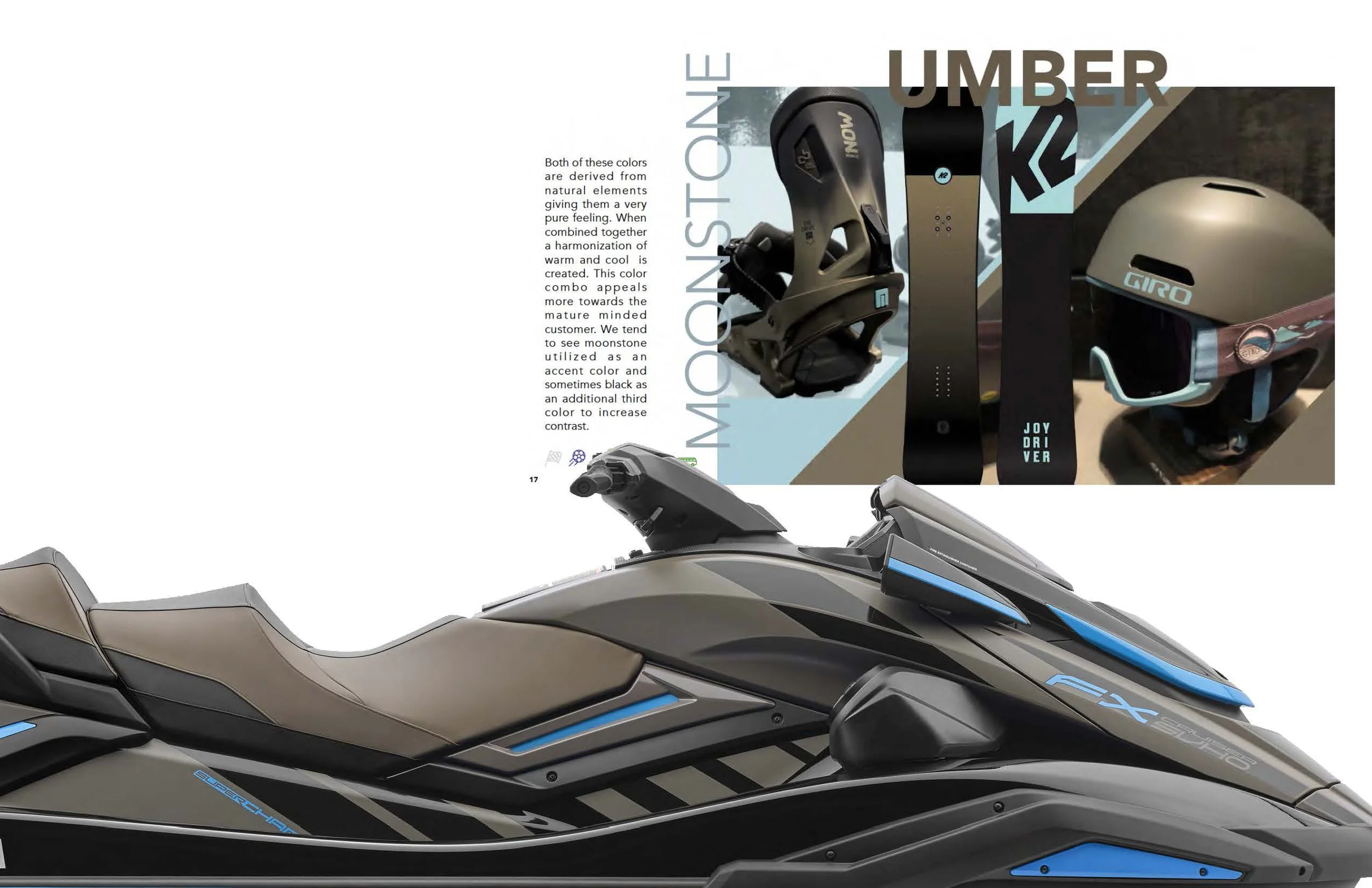 Instead of looking to automotive competitors, I studied adjacent markets. In the outdoor and snowboarding space, I noticed a recurring warm, earthy gray-green that felt grounded and premium and paired naturally with blue; which is a signature color for Yamaha. Using this as a foundation, I removed the green undertone and introduced a subtle red bias to create depth and warmth. The result was Titian Gray a refined, modern neutral that stood apart from the cooler, flatter grays dominating the market.